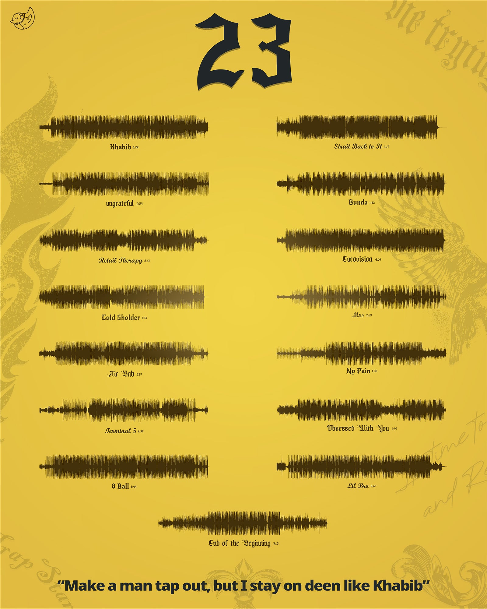 This print is inspired by "23", an album by Central Cee. The poster features an inspired style that pays homage to the album. They hold the power to elevate any Central Cee fan's space. Printed on high-quality semigloss paper, the posters are a high-quality representation of a fan's favorite music. Each poster comes with what we call "Tapbird Tech," meaning that if you tap the Songbird logo in the corner of your poster with your phone, it plays the music of your choice. That's pretty neat, right? The poster comes with a quote on it, but if you would like to change it, message me on Instagram with your order # and quote. All in all, a Songbird Music Decor poster is a one-of-a-kind gift for any music lover, and this 23 poster is perfect for any Central Cee enthusiast.