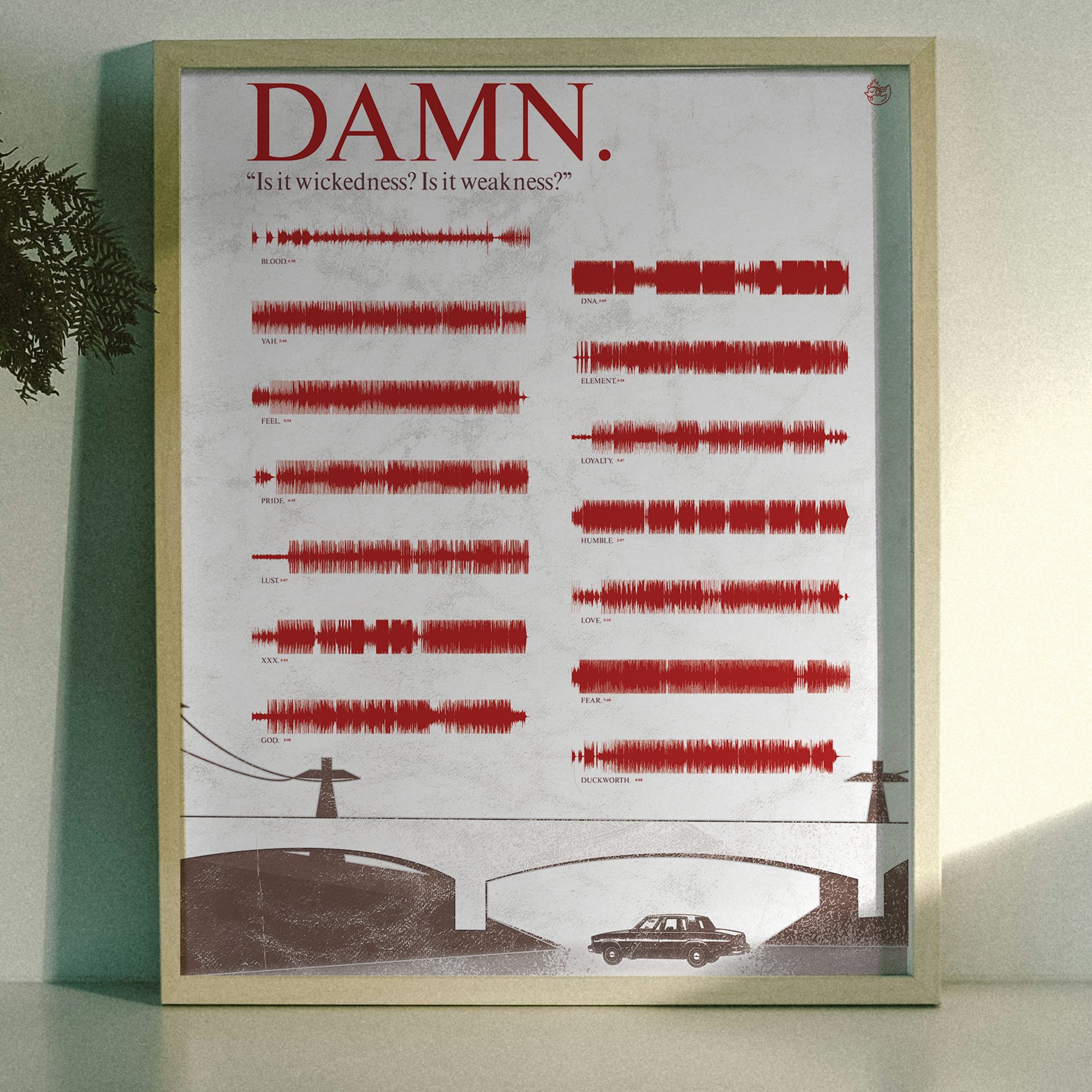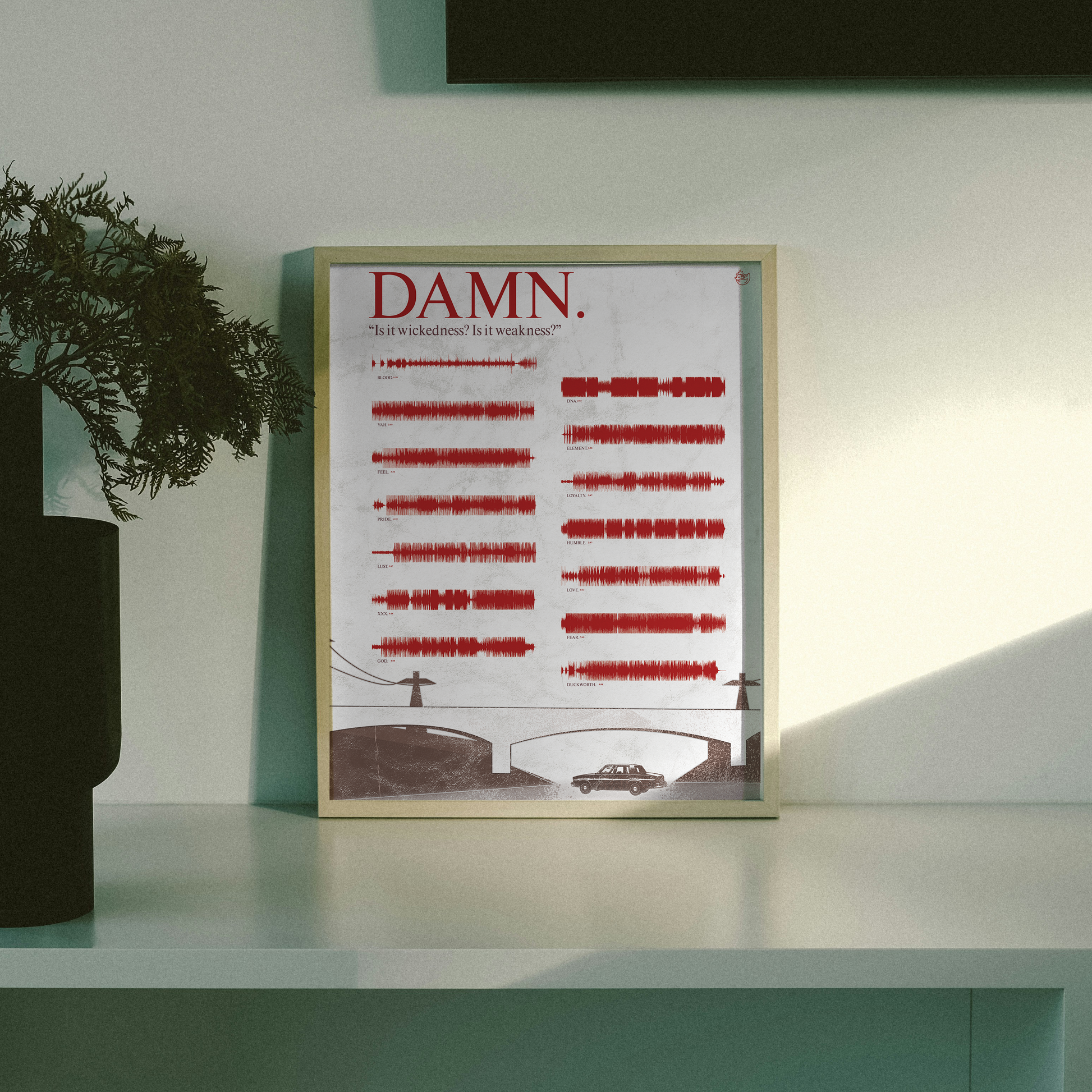 This print is inspired by "Damn", an album by Kendrick Lamar. The poster features an inspired style that pays homage to the album. They hold the power to elevate any Kendrick Lamar fan's space. Printed on high-quality semigloss paper, the posters are a high-quality representation of a fan's favorite music. Each poster comes with what we call "Tapbird Tech," meaning that if you tap the Songbird logo in the corner of your poster with your phone, it plays the music of your choice. That's pretty neat, right? The poster comes with a quote on it, but if you would like to change it, message me on Instagram with your order # and quote. All in all, a Songbird Music Decor poster is a one-of-a-kind gift for any music lover, and this Damn poster is perfect for any Kendrick Lamar enthusiast.