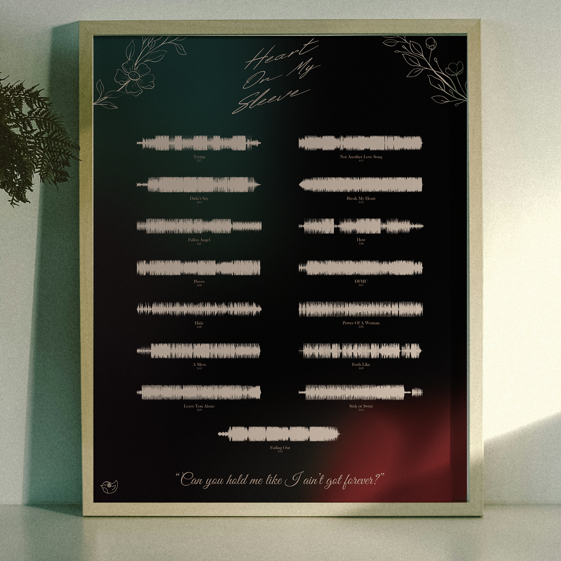 This print is inspired by "Heart on My Sleeve", an album by the artist Ella Mai. The poster features an inspired style that pays homage to the album. They hold the power to elevate any Ella Mai fan's space. Printed on high-quality semigloss paper, the posters are a high-quality representation of a fan's favorite music. Each poster comes with what we call "Tapbird Tech," meaning that if you tap the Songbird logo in the corner of your poster with your phone, it plays the music of your choice. That's pretty neat, right? The poster comes with a quote on it, but if you would like to change it, message me on Instagram with your order # and quote. All in all, a Songbird Music Decor poster is a one-of-a-kind gift for any music lover, and this Heart on My Sleeve poster is perfect for any Ella Mai enthusiast.