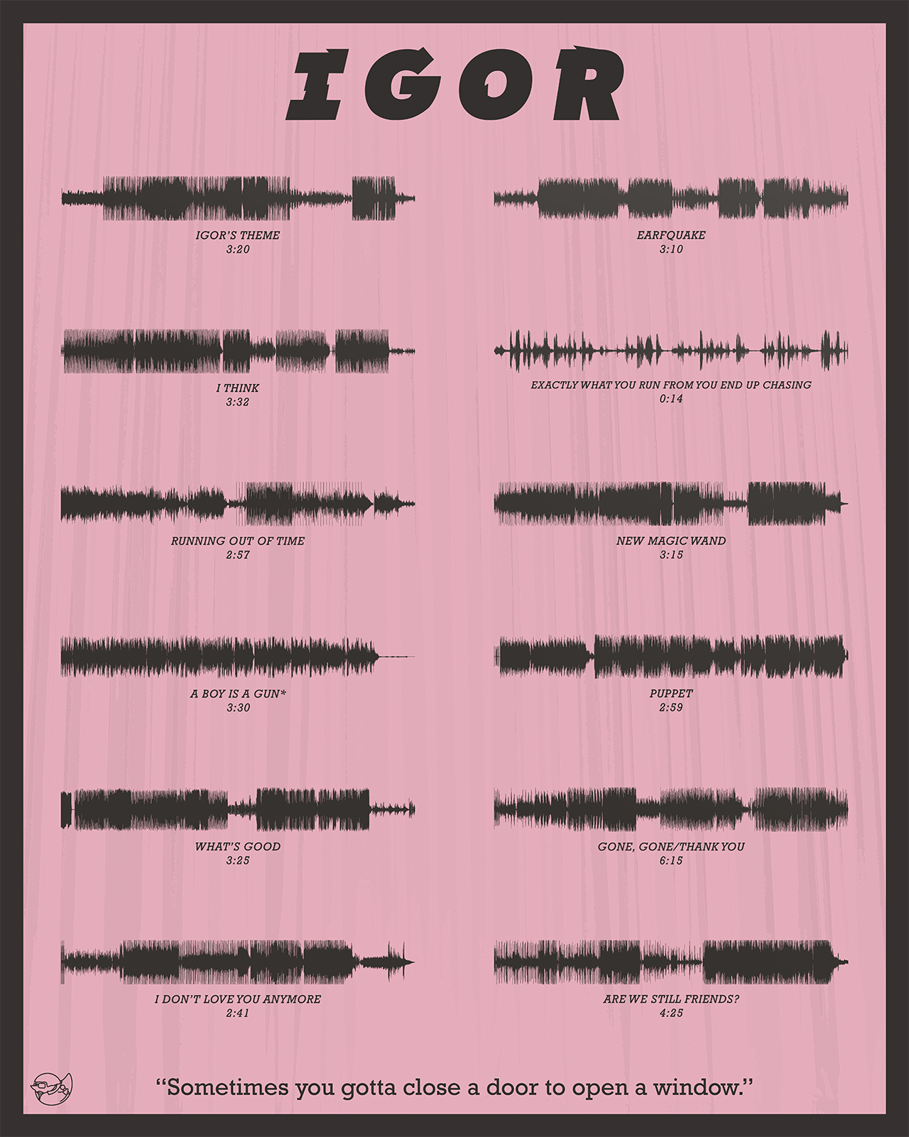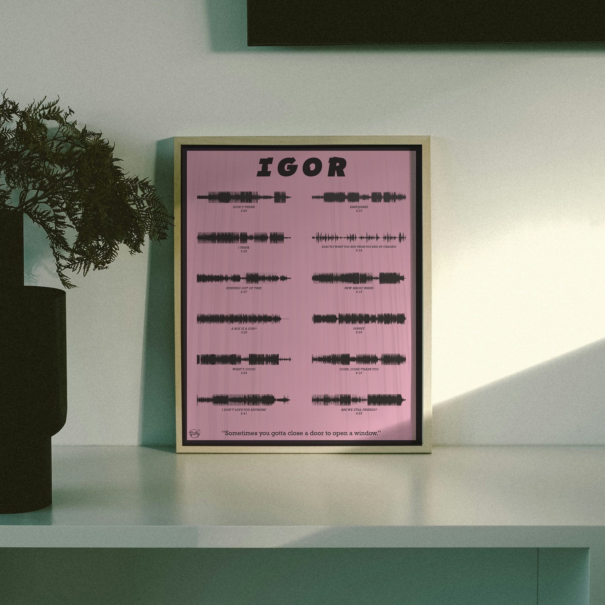 This print is inspired by "IGOR", an album by Tyler, The Creator. The poster features an inspired style that pays homage to the album, but can still complement any room. The poster comes with a quote on it, but if you would like to change it, message me on Instagram with your order # and quote.