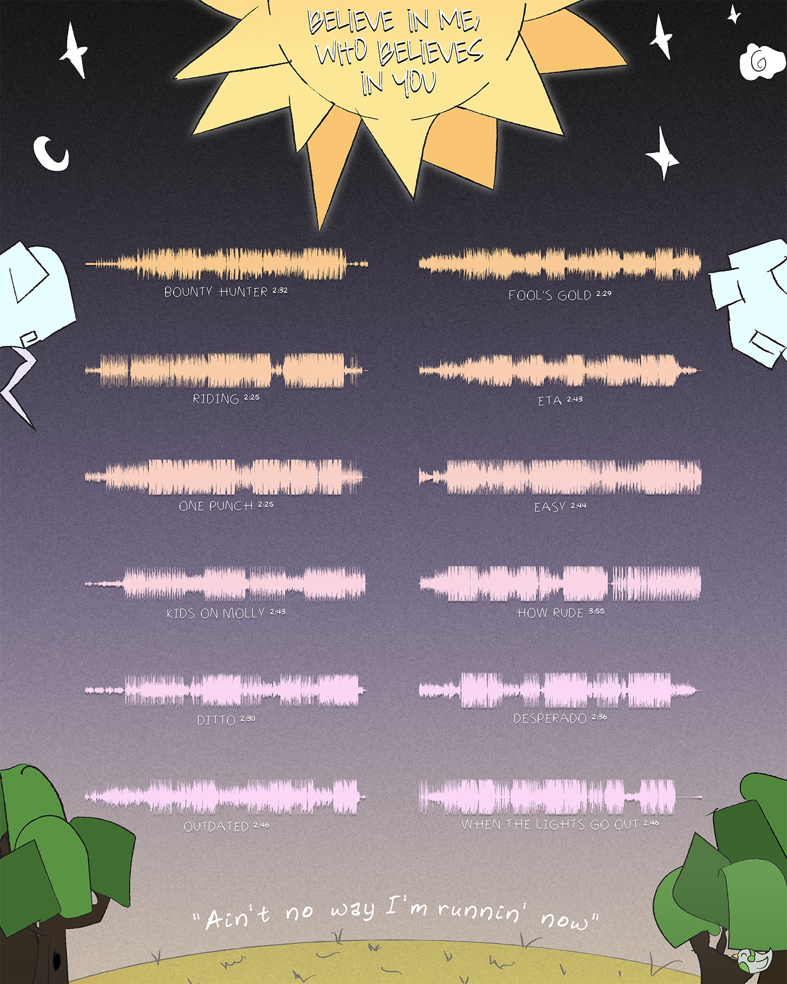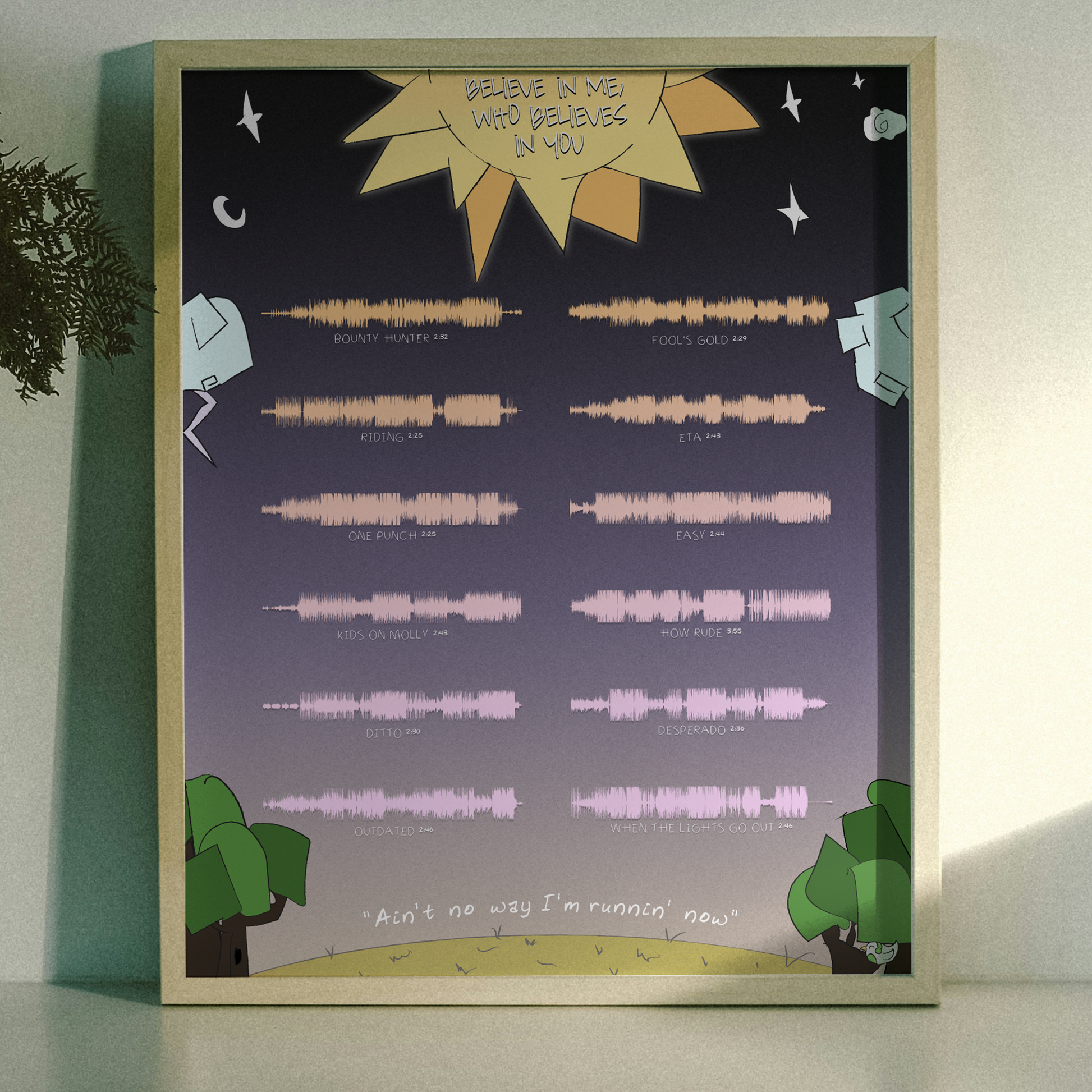 This print is inspired by "BELIEVE IN ME, WHO BELIEVES IN YOU ", an album by the artist Aries. The poster features an inspired style that pays homage to the album. They hold the power to elevate any Aries fan's space. Printed on high-quality semigloss paper, the posters are a high-quality representation of a fan's favorite music. Each poster comes with what we call "Tapbird Tech," meaning that if you tap the Songbird logo in the corner of your poster with your phone, it plays the music of your choice. That's pretty neat, right? The poster comes with a quote on it, but if you would like to change it, message me on Instagram with your order # and quote. All in all, a Songbird Music Decor poster is a one-of-a-kind gift for any music lover, and this BELIEVE IN ME, WHO BELIEVES IN YOU poster is perfect for any Aries enthusiast.